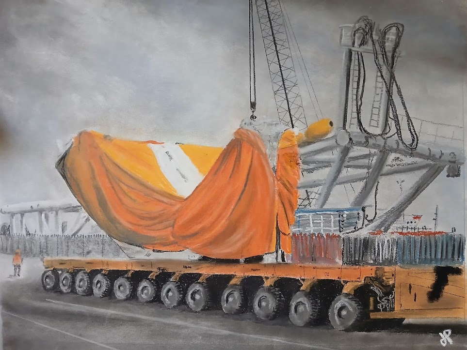 Voici un pastel « techno ». L’art s’intéresse assez peu aux objets technologiques. En voici un, immense, gigantesque, impressionnant. L’échelle de cette pièce constitutive d’un tore est représentée grâce à la taille de l’ouvrier en blanc tout en bas à gauche. La caractère fantasmagorique de cet objet, qui n’a pas encore été déballé, m’a conquis pour en faire un pastel. J’espère que ce dessin pourrait être le premier d’une série sur le programme Iter, démonstrateur pour le programme international de fusion nucléaire à Cadarache, pas très loin d’Aix-en-Provence.